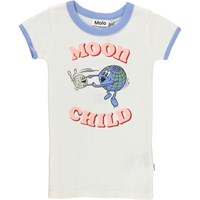 Rhiannon er en hvid ringer t-shirt med humoristisk print af månen og jordkloden, som slynger hinanden rundt. T-shirten har blå kantbånd.