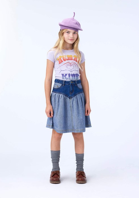 Lilla t-shirt i blødt økologisk bomuld med teksten ´Human Kind´på fronten og hænder der former et hjerte. T-shirten er tætsiddende, har en rund hals samt kantbånd i matchende farve.