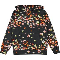 Rhona er en hættetrøje med lange ærmer og kængurolomme på fronten. Hættetrøjen er sort med print af farverige små blomster.