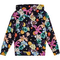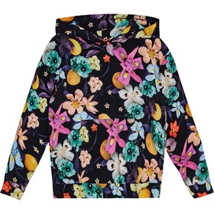 Langærmet jersey hættetrøje i økologisk bomuld med løs pasform, kængurulomme og ribkanter. Trøjen har et print af farverige blomster, der træder flot frem på den sorte baggrund.