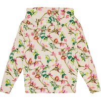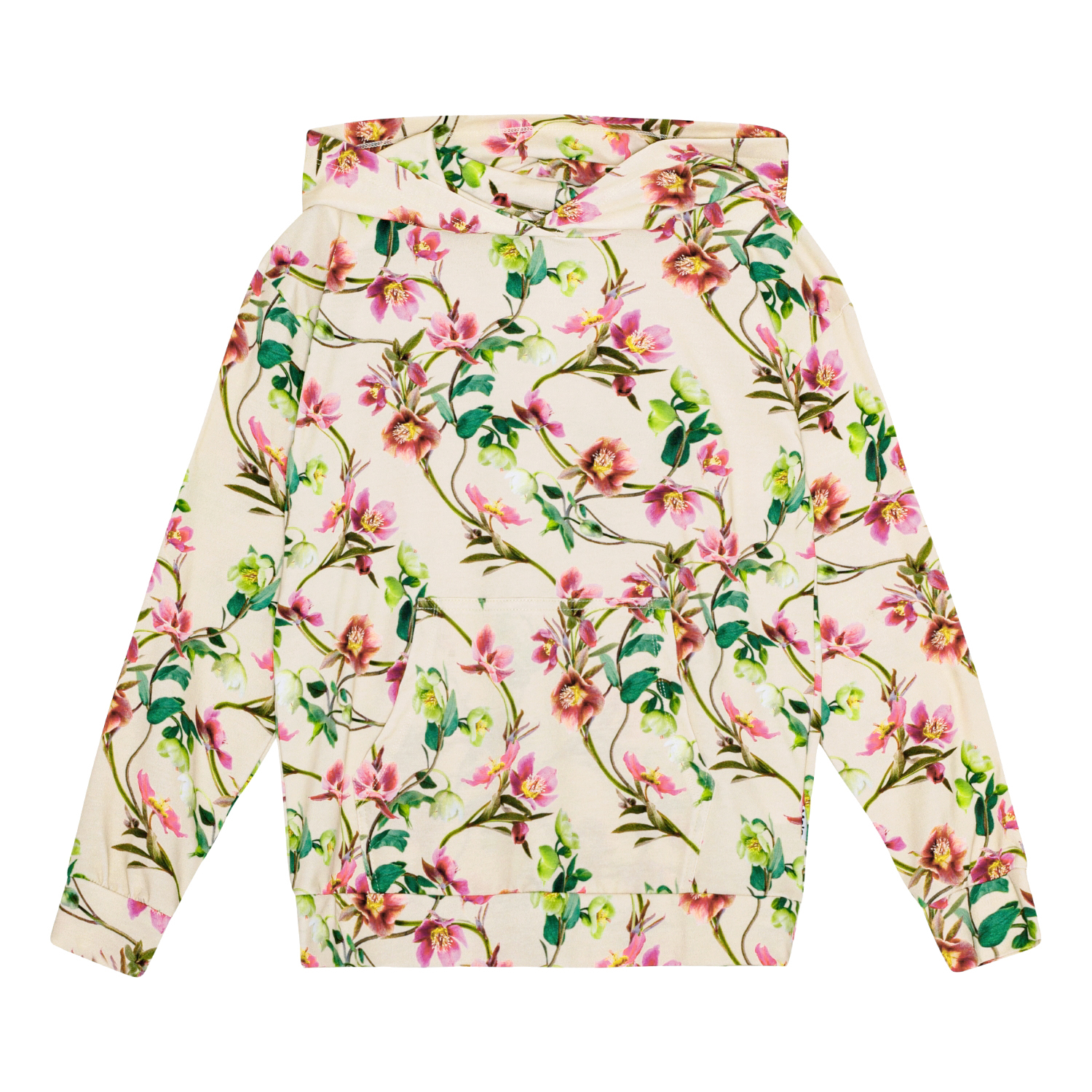 Langærmet jersey hættetrøje i økologisk bomuld med løs pasform, kængurulomme og ribkanter. Trøjen har et alloverprint af juleroser i hvide og lyserøde nuancer, der smukt grener sig sammen med deres grønne blade.