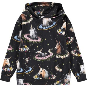 Sort hættetrøje i blødt, økologisk bomuld med et print af farverige papirblomster. Trøjen har en løs pasform, en kængurulomme og lange ærmer med ribkanter, der også findes langs kanten i bunden.