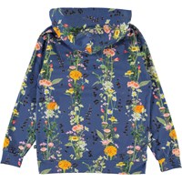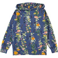 Rhona er en blå hættetrøje med print af vertikale blomsterranker. Blusen har en lækker tynd kvalitet og kænguru lomme på fronten. Certificeret af Ecocert Greenlife, certifikationsnr. 197496.