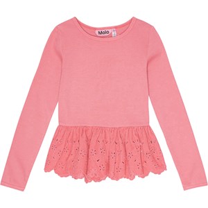 Koralfarvet og tætsiddende langærmet bluse i økologisk bomuldsrib med en flæsekant i fløjl fra taljen og ned, dekoreret med et hulmønster af små blomster.