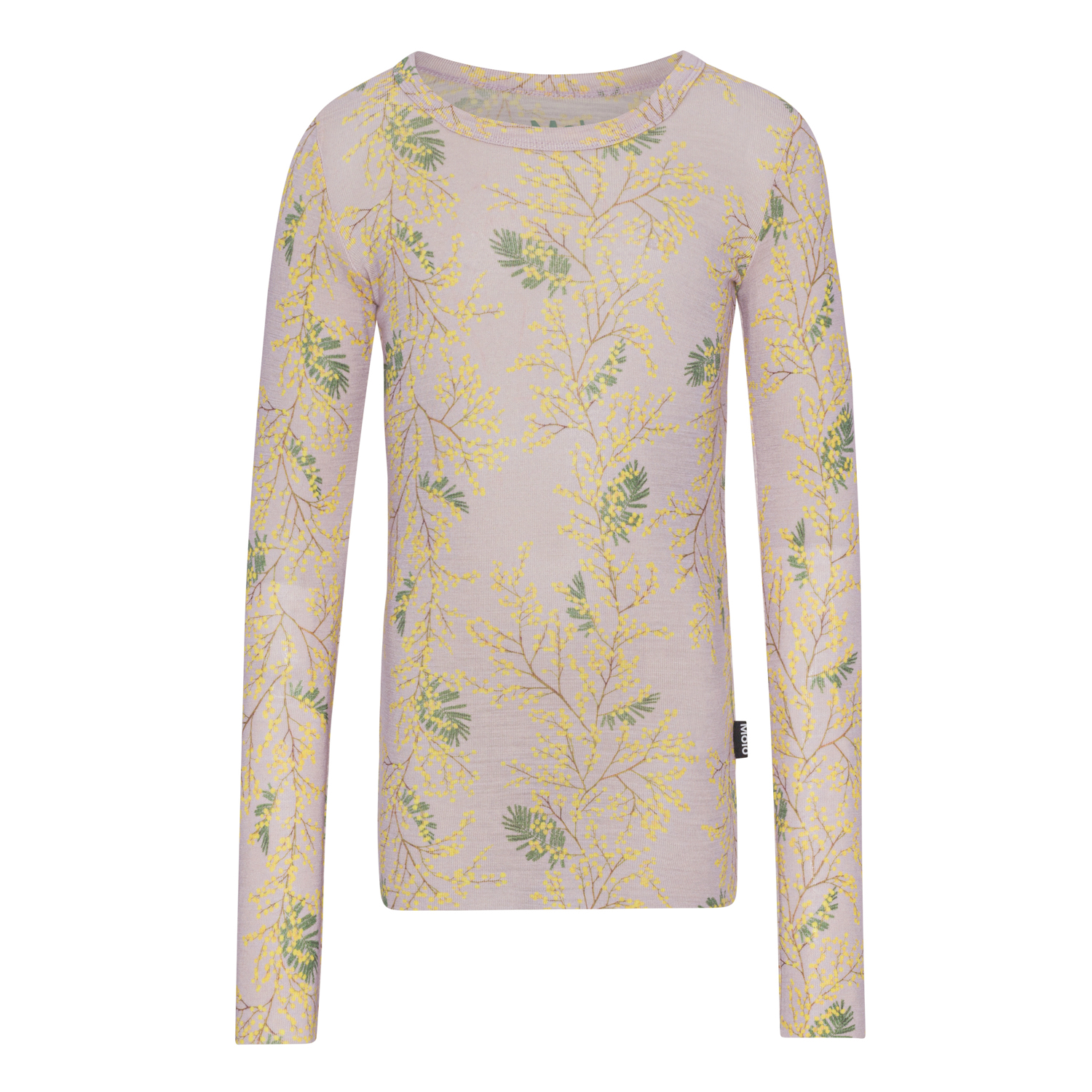 Lyselilla langærmet bluse i den blødeste uld, med allover print af gule mimosa blomsterrænker. Denne bluse er fremstillet i 100% Merino uld, der er perfekt til at give lige det ekstra varme lag på de koldere dage. Blusen har lange ærmer, en rund halsudskæring, samt et slim fit.