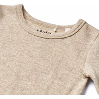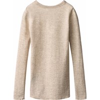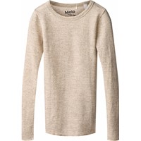 Beige meleret, langærmet bluse i blød merinould med tætsiddende pasform, rund halsudskæring og babylock-detaljer ved ærmerne og nederste kant. Kombinér med matchende leggings i samme farve for et fuldendt sæt.