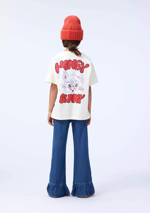 Råhvid t-shirt i blødt økologisk bomuld med korte ærmer og ribkant i halsen. T-shirten har en løs pasform og et stort rygprint af en kanin samt texten "Honey Bunny".