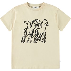 Råhvid t-shirt i blødt økologisk bomuld med korte ærmer og ribkant i halsen. T-shirten har en løs pasform samt et frontprint af håndtegnede heste i flok.