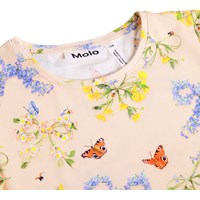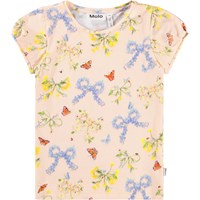 Lyserød tætsiddende t-shirt i blødt økologisk bomuld med rund hals og små korte ærmer med puf. T-shirten har et print af blomster og sommerfugle.
