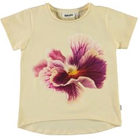 Risha er en gul t-shirt med print af en stor blomst på fronten. T-shirten har mere længde bagtil.