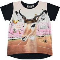 Risha er en sort t-shirt med print af forskellige dyr som dyrker sport og hepper på hinanden.