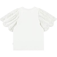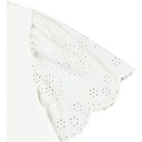 Hvid t-shirt i blød økologisk bomuld med ribkant i halsen. T-shirten har en løs pasform og store ærmer med broderi anglaise, som falder flot i den faste bomuld. Kombiner med matchende nederdel for et komplet sæt.