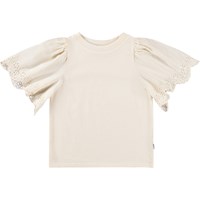 Beige t-shirt i blødt økologisk bomuld med ribkant i halsen. T-shirten har en løs pasform og store ærmer med broderi anglaise, som falder flot i den faste bomuld.