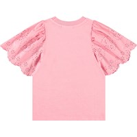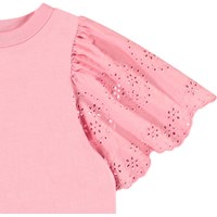 Lyserød t-shirt i blødt økologisk bomuld med ribkant i halsen. T-shirten har en løs pasform og store ærmer med broderi anglaise, som falder flot i den faste bomuld. Kombiner med en matchende nederdel for et komplet sæt.