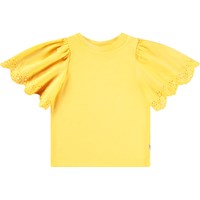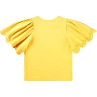 Gul t-shirt i blødt økologisk bomuld med ribkant i halsen. T-shirten har en løs pasform og store ærmer med broderi anglaise, som falder flot i den faste bomuld.
