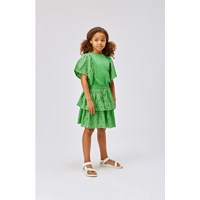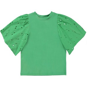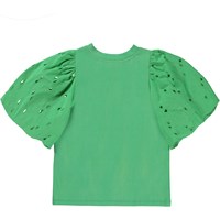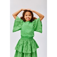 Ritza er en frisk grøn top med smukke, korte broderie anglaise ærmer. Ærmerne rynker på toppen af skulderen, der skaber en elegant puf-effekt. Kombinér med den matchende nederdel, Brigitte, for et komplet outfit.