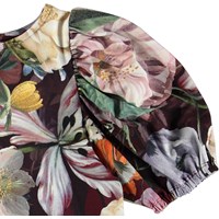 Rivera er en bluse med pufærmer i bordeauxrød og print af store blomster. Blusen har en rund halsudskæring og elatik kant ved ærmeafslutning, som gør at ærmet sidder perfekt.