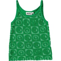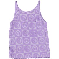 Lilla frotté top i en blød bomuldsblanding med ternet mønster. I mønstret ses smilende emojis, yin og yang symboler og peacetegn. Toppen har stropper og er almindelig i pasformen. Den bløde frotté gør den ideel til at tage med på stranden eller til poolen.