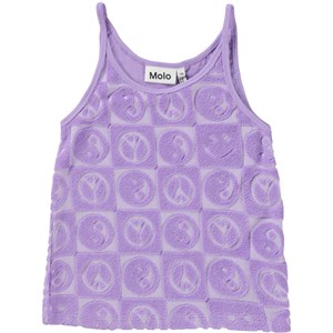 Lilla frotté top i en blød bomuldsblanding med ternet mønster. I mønstret ses smilende emojis, yin og yang symboler og peacetegn. Toppen har stropper og er almindelig i pasformen. Den bløde frotté gør den ideel til at tage med på stranden eller til poolen.