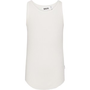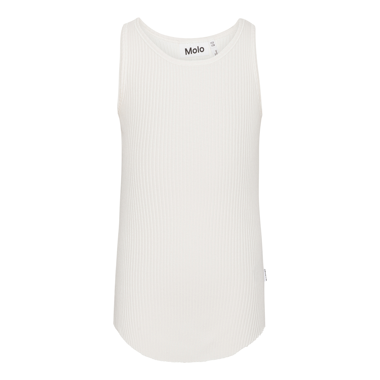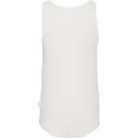Hvid tanktop i blødt økologisk bomuld i strækbart ribstrik. Toppen har en tætsiddende pasform og en rund kant forneden.