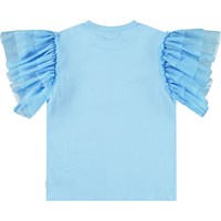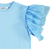 Lyseblå t-shirt i blødt økologisk bomuld med ribkant i halsen. T-shirten har en løs pasform og 3 lag tylærmer, som falder flot ned over skulderen.