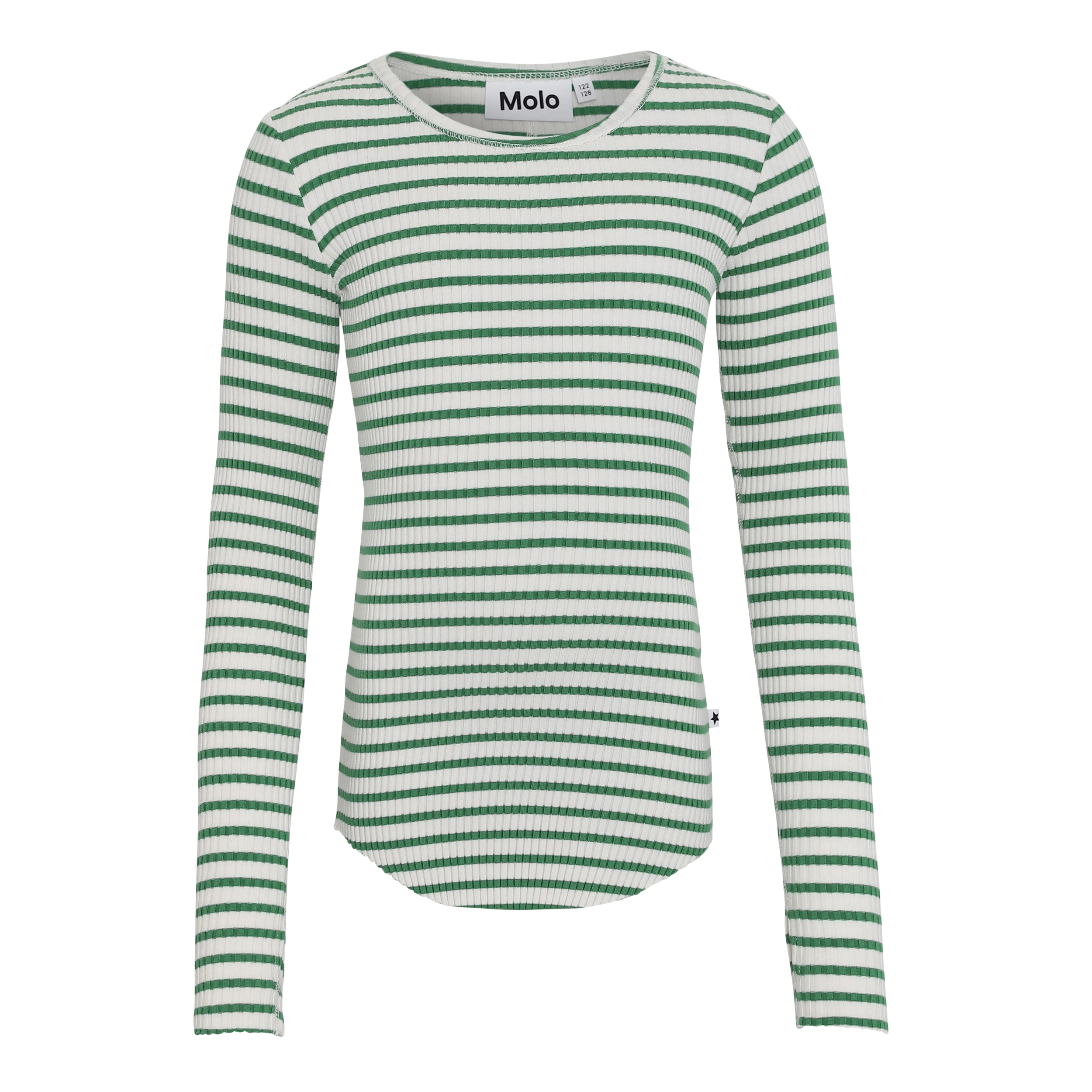 Rochelle er den perfekte basic bluse, som du aldrig får nok af. Rochelle er her i grøn og hvid stribet. Blusen er i rib kvalitet og har hul til tommelfingrene.