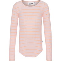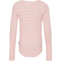 Lys koral langærmet bluse med orange neon striber. Blusen er i en blød økologisk bomuld, i strækbart ribstrik. Blusen har en tætsiddende pasform og en rund halsudskæring. Rå kanter ved begge ærmer og med hul til tommelfingeren. En gennemgående lodret syning midt på ryggen og en rå afrundet kant i bunden.