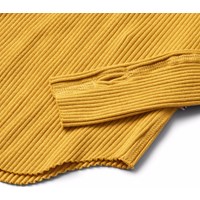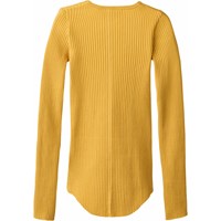 Gul langærmet bluse i strækbart økologisk bomuldsrib med en tætsiddende pasform, rund halsudskæring, rå kanter ved begge ærmer med tommelfingerhuller. Ydermere har blusen en lodret søm midt på ryggen samt en rå, afrundet kant i bunden.