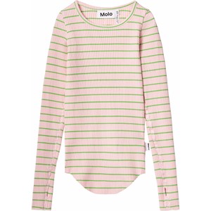 Lyserød og grøn stribet langærmet bluse i strækbart økologisk bomuldsrib med en tætsiddende pasform, rund halsudskæring, rå kanter ved begge ærmer med tommelfingerhuller. Gennemgående lodret syning midt på ryggen og en rå, afrundet kant i bunden.