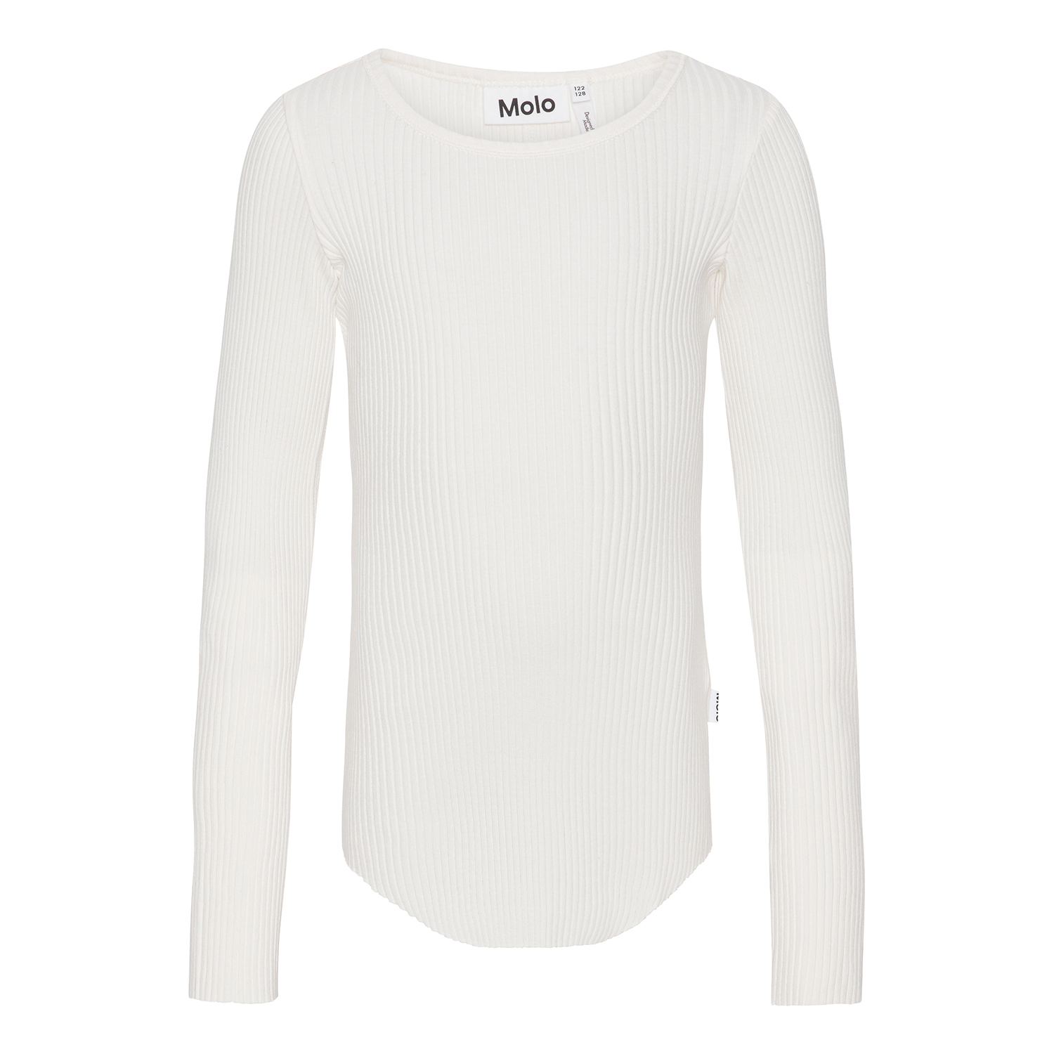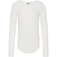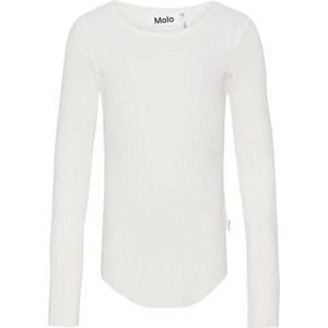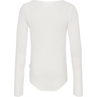 Hvid langærmet bluse lavet af blød økologisk bomuld i strækbart ribstrik. Blusen har en tætsiddende pasform og en rund halsudskæring. Rå kanter ved begge ærmer og med hul til tommelfingeren. En gennemgående lodret syning midt på ryggen og en rå afrundet kant i bunden.
