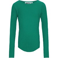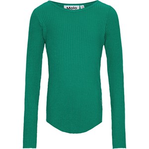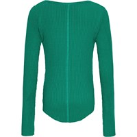 Grøn langærmet bluse i strækbart økologisk bomuldsrib med tætsiddende pasform, rund halsudskæring, rå kanter ved begge ærmer med tommelfingerhuller. Gennemgående lodret syning midt på ryggen og en rå, afrundet kant i bunden.