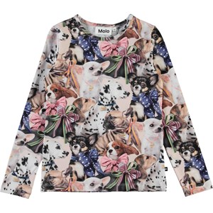 Rose er en langærmet bluse med print af små hunde, som har sløjfe om halsen. Rose har en rund halsudskæring. Certificeret af Ecocert Greenlife, certifikationsnr. 197496.
