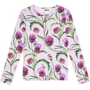 Lilla langærmet bluse i økologisk bomuld. Blusen er tætsiddende med rund hals, samt et alloverprint af artiskokker i røde, lilla og grønne nuancer.