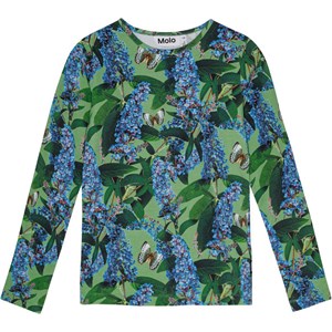 Tætsiddende langærmet grøn bluse i økologisk bomuld med rund hals. Blusen har et alloverprint af blålilla sommerfuglebuske med flyvende sommerfugle i flotte farver.
