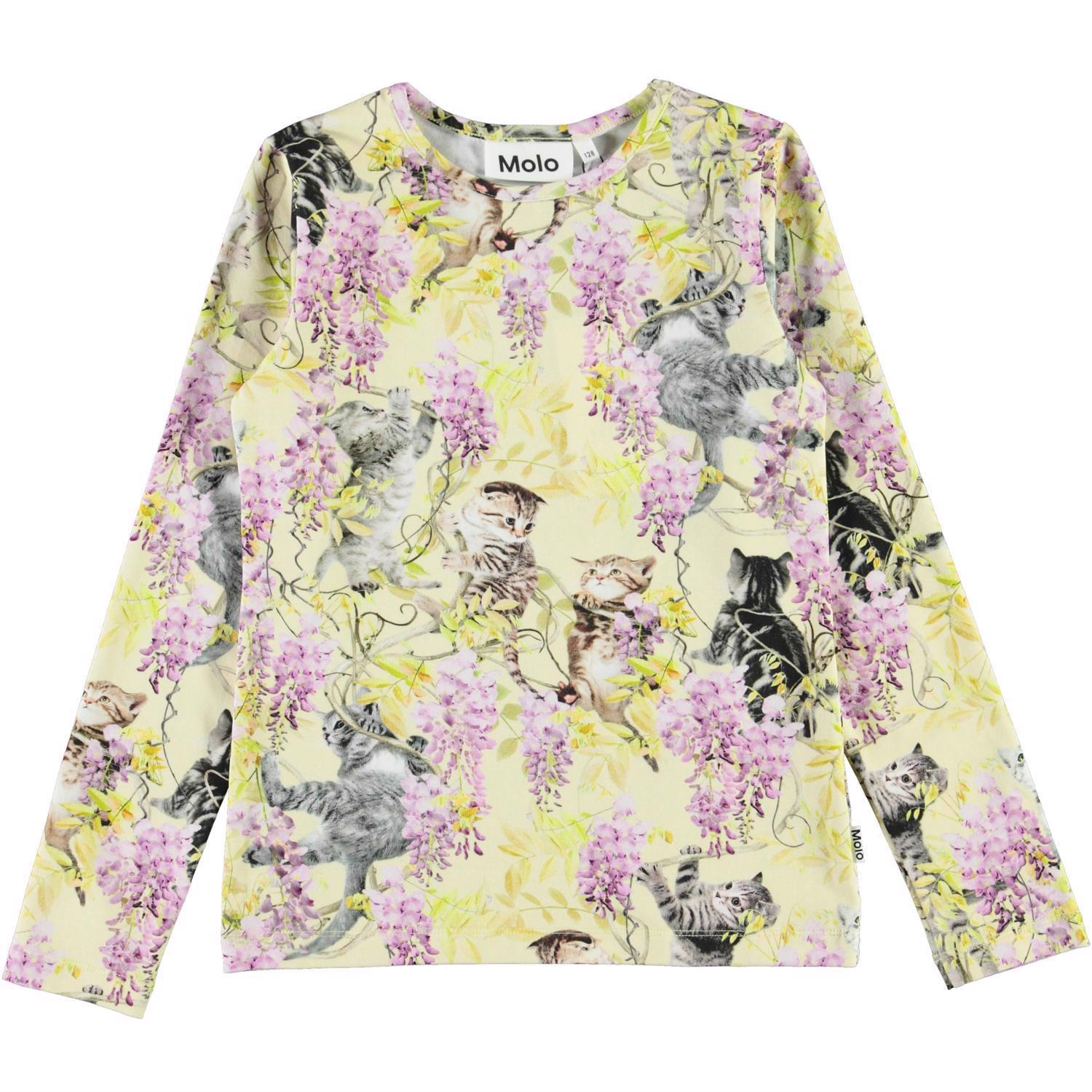Rose er en langærmet bluse med print af små søde katte, som klatrer i blomsterne. Rose har en rund halsudskæring.