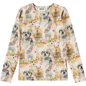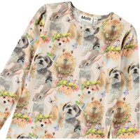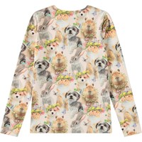 Langærmet bluse i økologisk bomuld med rund hals. Blusen er tætsiddende med et farverigt alloverprint af nuttede dyr med blomsterkranse.