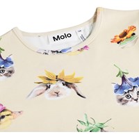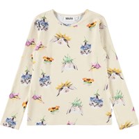 Beige langærmet bluse i økologisk bomuld med rund hals. Blusen er tætsiddende med et farverigt print af dyr der bærer blomsterhatte.