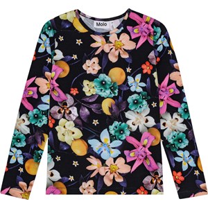 Tætsiddende langærmet sort bluse i økologisk bomuld med rund hals. Blusen har et print af farverige blomster.