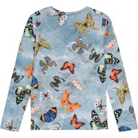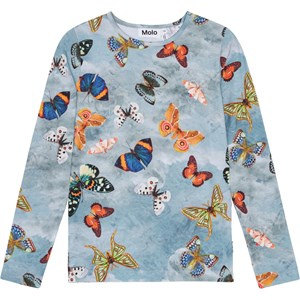 Tætsiddende langærmet blå bluse i økologisk bomuld med rund hals. Blusen har et print af farverige sommerfugle, der danser på en himmel i blå nuancer.