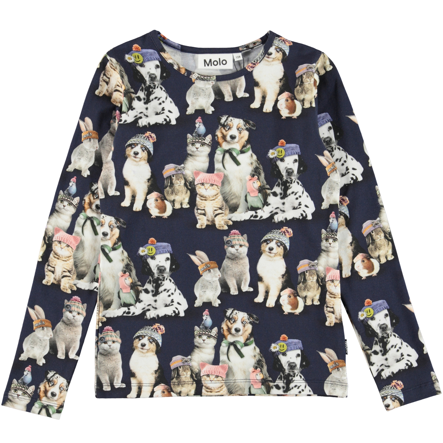 Rose er en mørkeblå bluse med print af forskellige kæledyr med hue eller pandebånd på.
