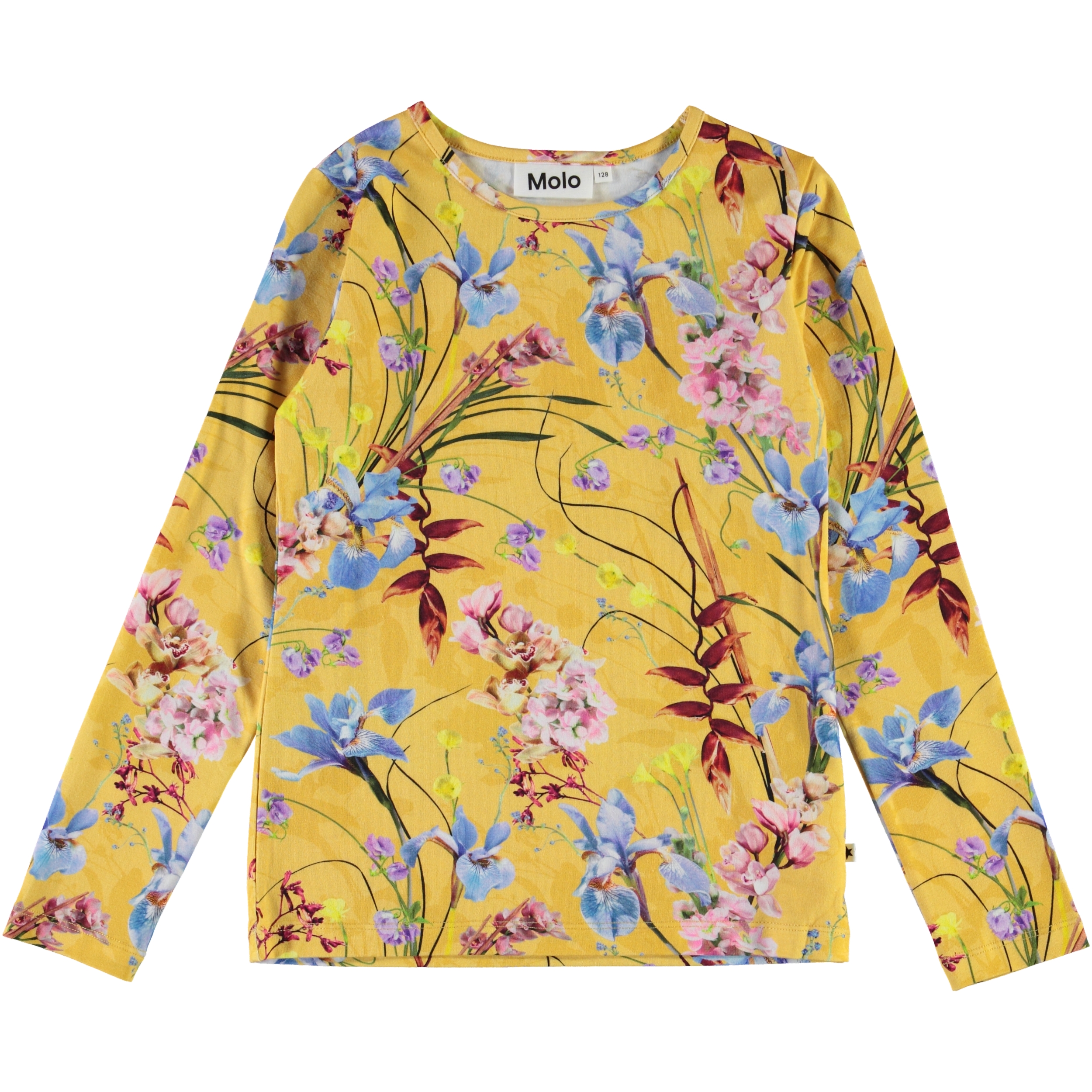 Rose er en langærmet bluse i gul med flot all-over blomster print. Rose har en rund halsudskæring.