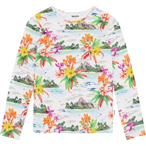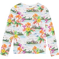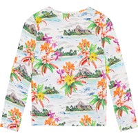 Langærmet bluse i økologisk bomuld. Blusen er tætsiddende med rund hals, med et alloverprint af øde øer, palmestrande og Hawaii blomster i friske farver.