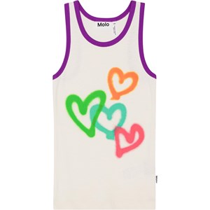 Hvid tætsiddende tanktop i økologisk bomuld. Toppen har lilla kantbånd langs hals og ærmegab samt et graffitiprint med multifarvet hjerter trykt på fronten.
