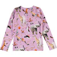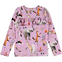 Rosita er en lilla langærmet bluse med print af dyr som dyrker sport. Rosita har en rund halsudskæring, samt flæsekant over brystet.