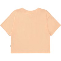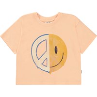Ferskenfarvet cropped t-shirt med frontprint af et halvt peacetegn og et halvt smilende ansigt, som tilsammen danner en harmoniske enhed. Denne t-shirt er fremstillet i 100% bomuld, har korte ærmer, en rundhalsudskæring med ribkant, samt et loose fit.