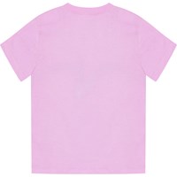 Lyserød t-shirt i økologisk bomuld med korte ærmer, rund halsudskæring og ribkant. Den har en almindelig pasform og et placeret print af en regnbue, der former sig som et smilende ansigt.