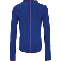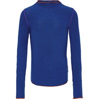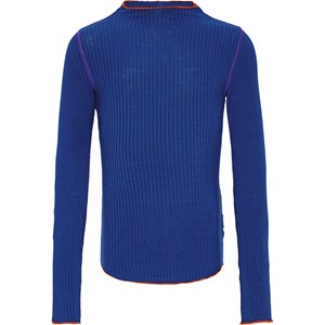 Marineblå langærmet bluse i blød viskose med tætsiddende pasform, rund halsudskæring og røde/lilla overlock-kanter ved ærmer, skuldre, ryggen og bunden af blusen.