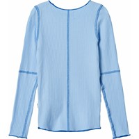 Langærmet lyseblå bluse i blødt ribbet viskose. Blusen har en tætsiddende pasform, rund hals samt rå mørkeblå kanter, og er med til at give blusen en flot finish.