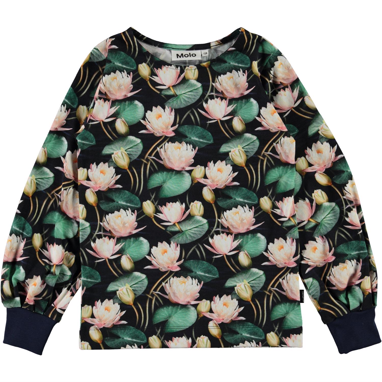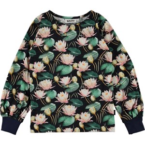Ryle er langærmet bluse med print af lyserøde åkander på en mørk baggrund. Blusen har brede ærmer med elastisk ribkant ved ærmeafslutningen.