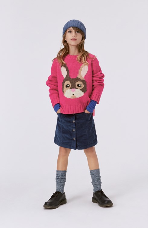 Pink striktrøje med kaninmønster. Denne striktrøje er fremstillet i en blød uld/akryl blanding, har en nuttet kanin på fronten, en rund halsudskæring med ribkant, raglansnit, lange ærmer med ribkant, ribkant ved hoften, samt et loose fit. Perfekt strik til de lidt koldere dage.